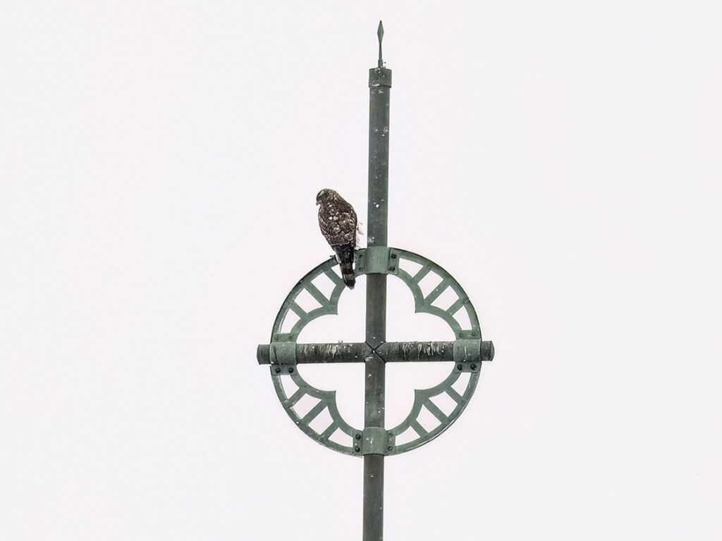 Kaupunkikämppämme edessä Turussa on 77 metriä korkea Mikaelin kirkko, jonka huipussa olevassa ”koristeessa” istuu silloin tällöin joku lintu – nyt varpushaukka. Kuvat parvekkeeltamme, haukkakuva Sigma 500/5.6 objektiivilla.