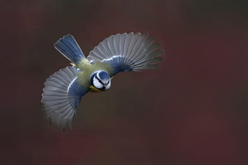Sinitiainen taustanaan tumma rakennuksen seinä